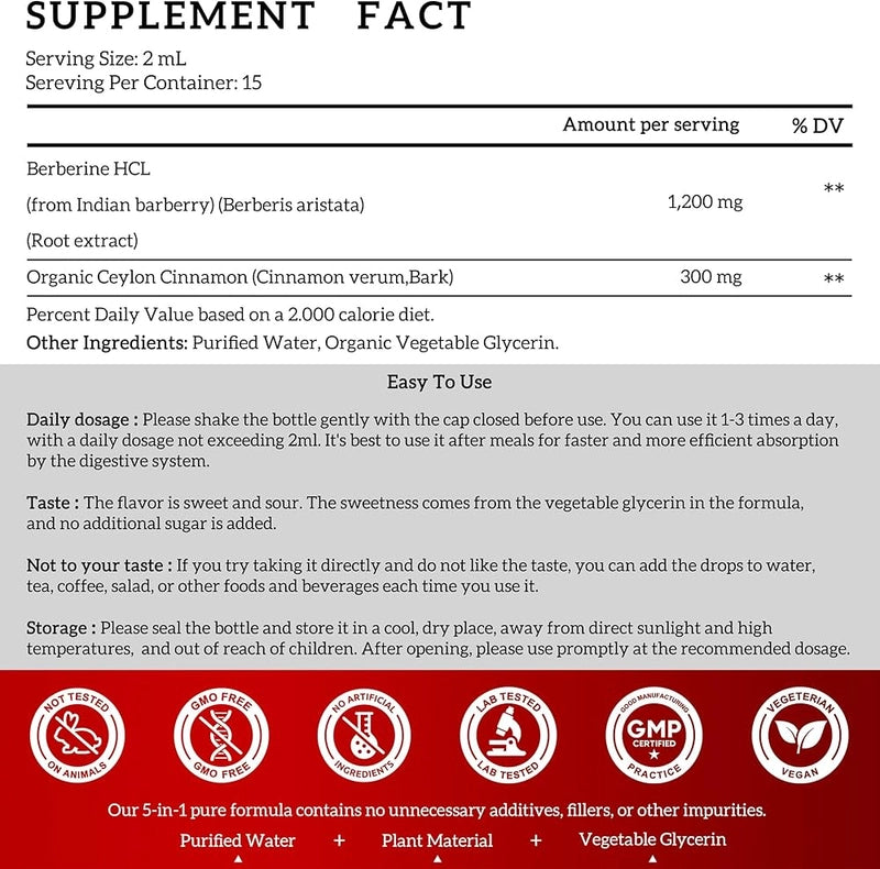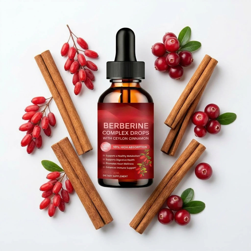 Our Berberine Complex Liquid Drops combine 1200mg of high-potency Berberine with Ceylon Cinnamon, known for its synergistic benefits. The liquid form ensures 98% high absorption, delivering active compounds directly into your system for maximum impact on metabolism, digestion, and heart health.